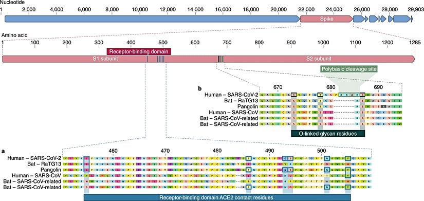 Bilim insanları, SARS-CoV-2’deki S proteinlerinin RBD kısmının insanlarda kan basıncını düzenleyici bir reseptör olan ACE2 hücrelerinin dışındaki moleküler bir özelliği hedef alacak şekilde evrimleştiğini buldular. SARS-CoV-2’deki S proteini insan hücrelerine o kadar iyi bağlanıyordu ki bilim insanları virüsün genetik mühendisliğinin bir ürünü değil, doğal seçilim sonucunda ortaya çıktığı sonucuna vardılar.