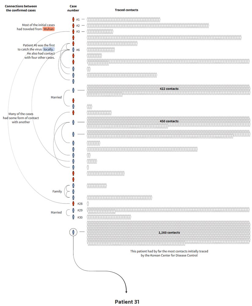 ReutersKore Hastalık Kontrol ve Önlem Merkezi’nin başlangıçta edindiği listede, bu iki Shincheonji kilise ayinlerine katılan kişi sayısı 9,300’dü ve bunlardan yaklaşık 1,200’ü grip benzeri belirtilerden şikâyetçi olmuşlardı. Şimdi ise binlerce vaka doğrulanmış durumda.