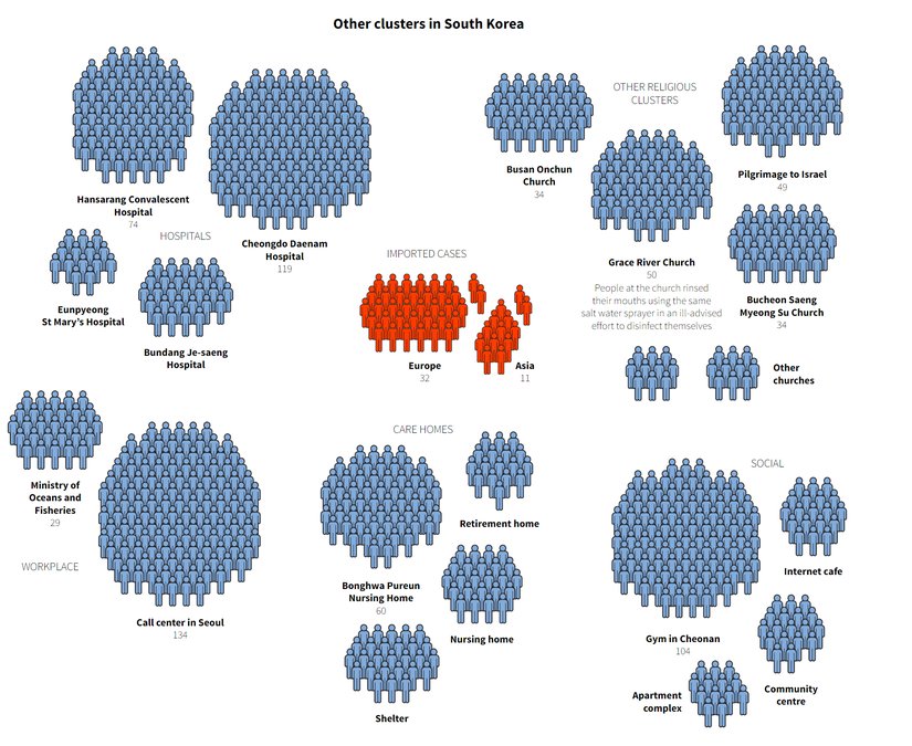 ReutersGüney Kore’de daha küçük birçok enfeksiyon öbeği oluştu. Kiliseler, hastaneler ve bakım evleri öbeklerin çoğunluğunu oluştursa da sosyal mekânlar ve işyerlerinde de salgın görüldü.