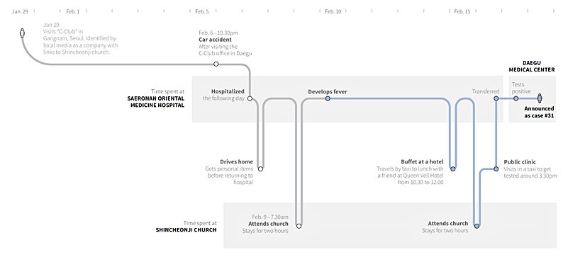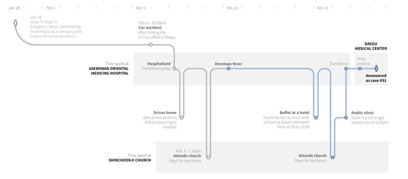 Reuters31. Hasta’nın virüsü nereden kaptığı tam olarak belli değil, ancak tanı koyulmasından önceki günlerde, Daegu’daki kalabalık yerlerde ve başkent Seul’da gezdiği biliniyor. 6 Şubat’ta Daegu’da küçük bir trafik kazası geçirdi ve Oriental Hastane’sine giriş yaptı. 9 ve 16 Şubat tarihlerinde, hala o hastane’de yatarken, Shincheonji İsa Kilisesi’nin Daegu şubesindeki ayinlere katıldı.