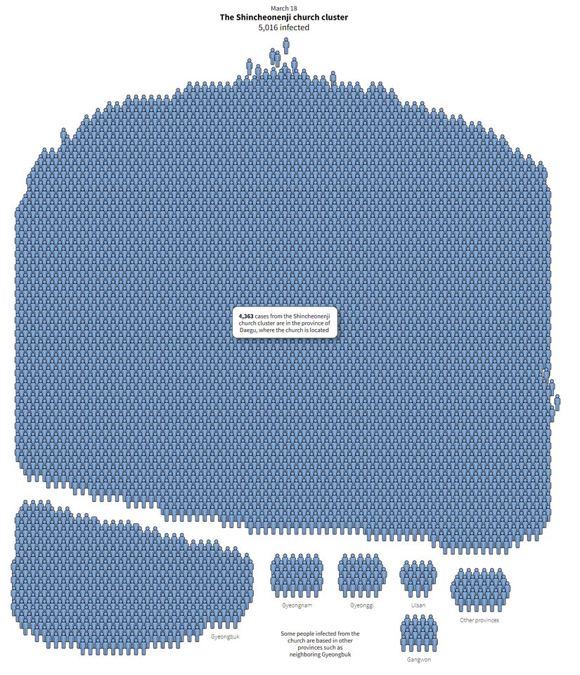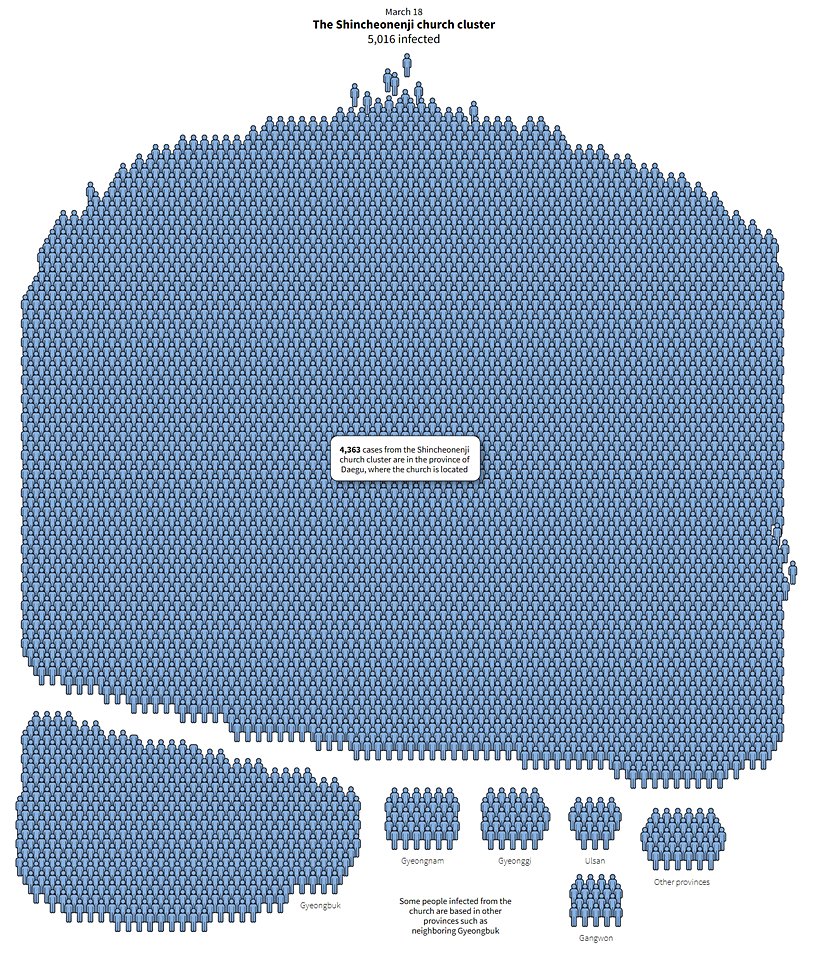 18 Mart’tan beri, Shincheonji Kilisesi enfeksiyon öbekleri Güney Kore’deki vakaların en az %60’ını oluşturuyor.