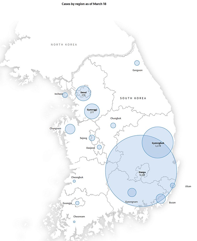 Güney Kore, Şubat’ın yalnıza son birkaç gününde binlerce korona virüs vakası duyurdu. Vakalardaki kabarıklığın odak noktası büyük oranla Daegu şehrindeki bir grup kilise mensubu. Salgın başlangıçta, Güney Kore’nin vaka sayısını Çin haricindeki her yerden daha yükseğe çıkardı ve o andan beri vakalar artışta.