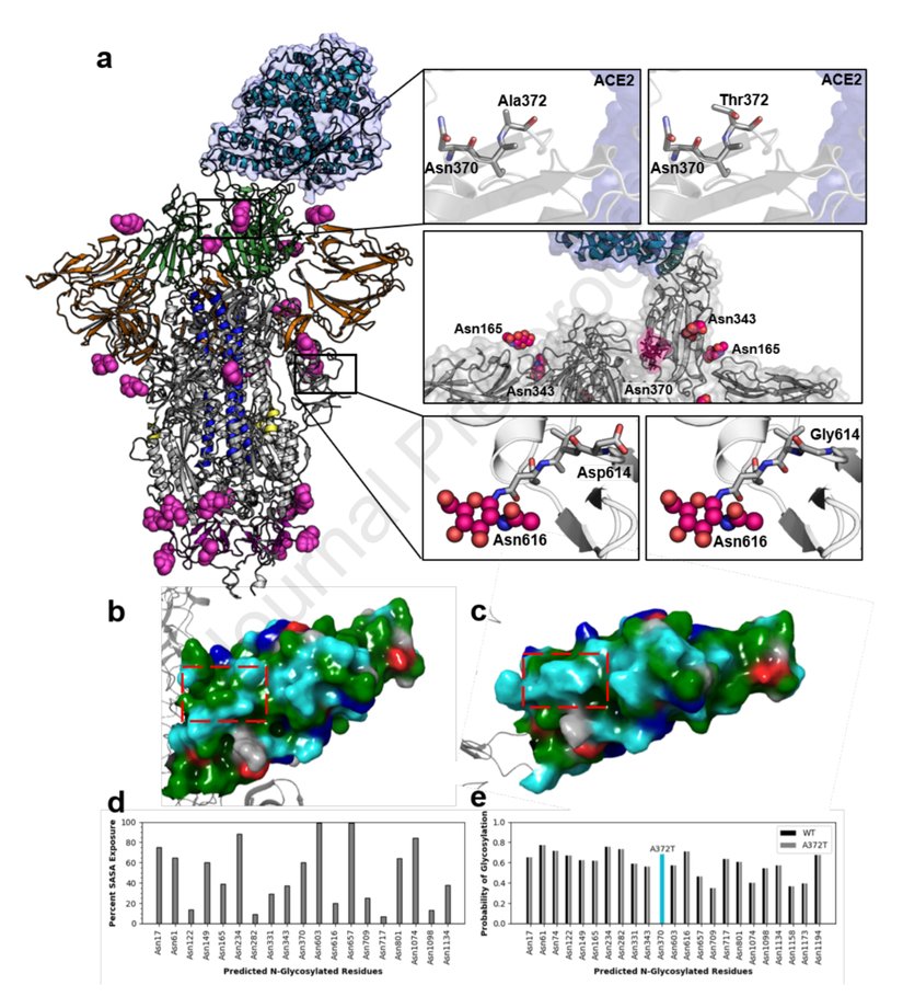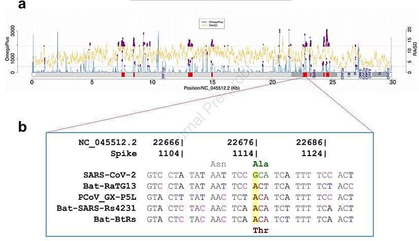 Çalışma yazarları, ile yaptıkları çalışmada, reseptör bağlanma alanlarında (İng: "receptor binding domain" ya da kısaca "RBD") bulunan bu genlerde, bugüne kadar dizilenen SARS-CoV-2'ye ait 182.000 ayrı genom örneğinde sabitlenmiş, eşanlamlı olmayan (yani fiziksel değişime neden olan) 1 adet nükleotid polimorfizmi belirlediklerini söylüyorlar. Bu mutasyon, tüm insan SARS-CoV-2 dizilerinde mevcuttur, ancak yarasalar ve pangolinlerle yakından ilişkili virüslerde yoktur. Bu durum, o mutasyonun virüsün insana geçmesini kolaylaştırıcı bir faktör olduğuna işaret ediyor.