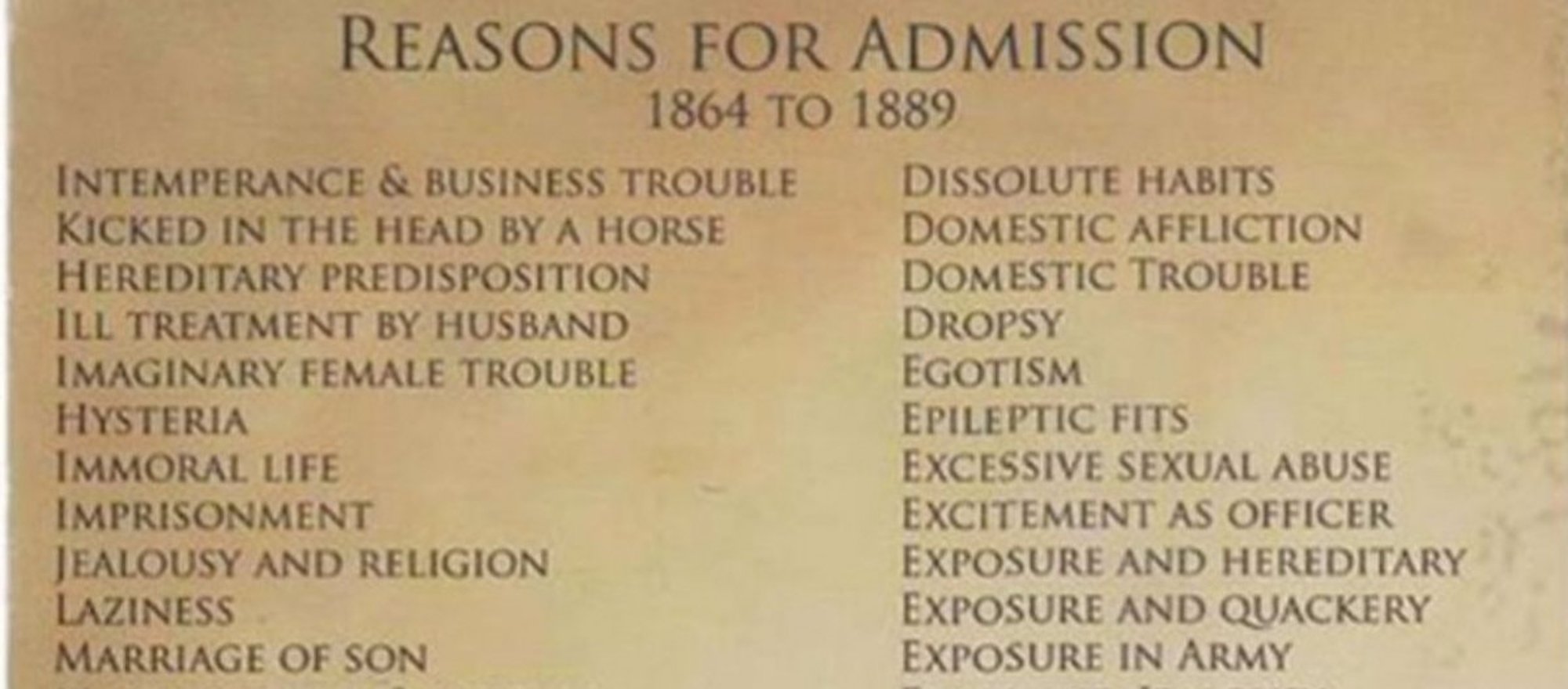 19. yüzyılda insanların akıl hastanesine yatırılması gerektiğini düşündüren durumlara dair bir liste, deliliğin tanımlanmasının ne kadar zor olduğunu ve psikiyatrinin son 1.5 asırda ne kadar geliştiğinin harika bir göstergesidir. Bu listede yer alan sorunlar, 1864-1889 yılları arasında insanların Trans-Allegheny Akıl Hastanesine yatırılan bazı hastaların gerekçeleridir: