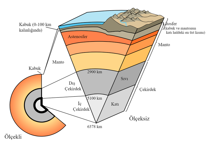 Dünya’nın yapısına baktığımızda jeolojik ve jeofizik çalışmalardan elde edilen bilgilere göre bir yeryüzü modeli oluşturulmuştur. Modele göre yerkürenin 70-100 km kalınlığında bir taşküre yani “litosfer” bulunmaktadır. Okyanuslar ve kıtalar burada bulunmaktadır. Diğer bir bölge ise “manto”dur. Manto genelde katıdır; ama yerel bazda sıvı ortamları da vardır. Mantonun altında çekirdek bulunmakta olup demir-nikel karışımına sahiptir. Çekirdeğe gidildikçe sıcaklık artmakta olup enine dalgaların yayılabilmesi için çekirdeğin sıvı olması gerektiği sonucu ortaya çıkmaktadır.