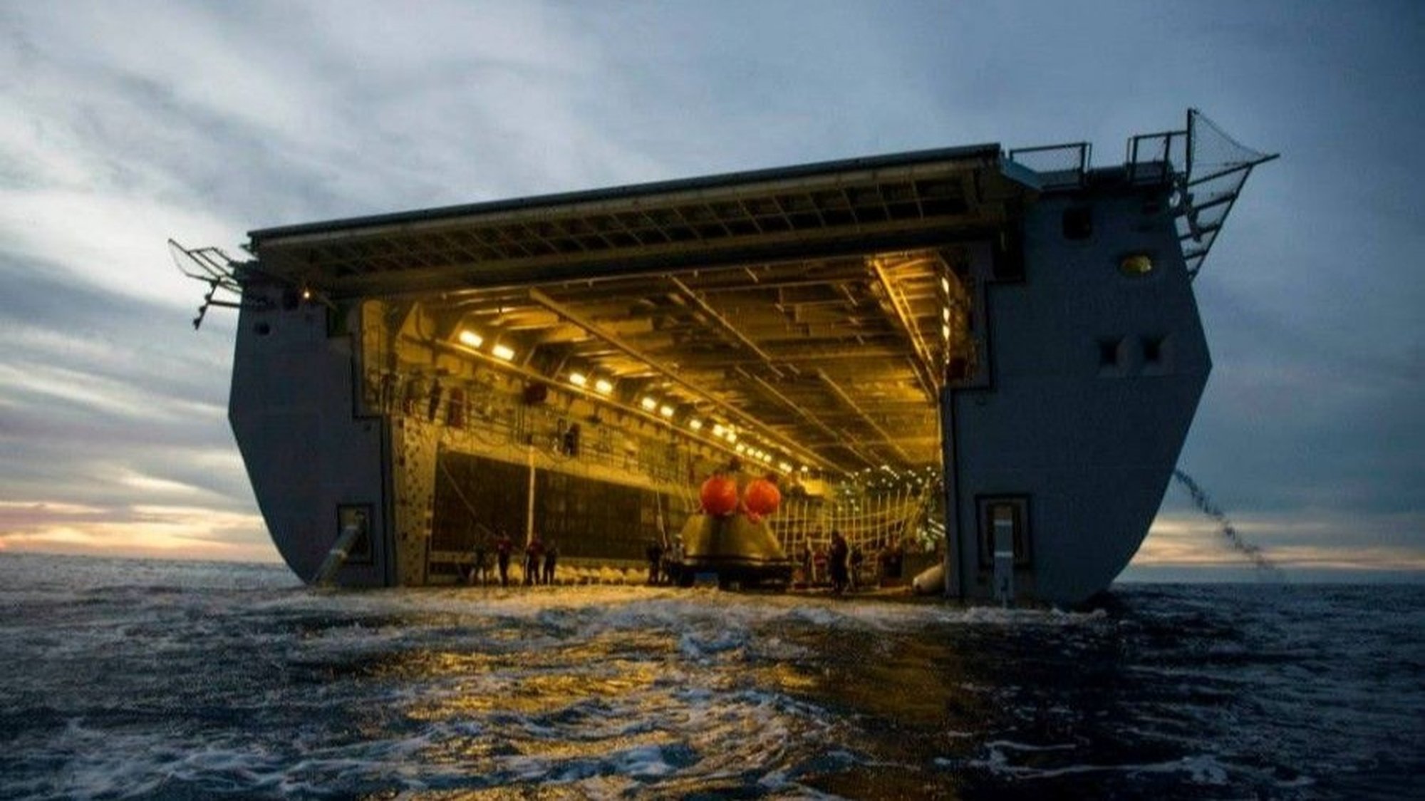 Burada gördüğünüz ise, ABD Donanması'na ait USS Anchorage gemisi. Orion'u Pasifik Okyanusu'nda düştüğü noktadan 8 Aralık 2014'te aldı ve karaya geri taşıyor. Gemi bünyesindeki 4 ufak tekne, ABD'nin batı yakasındaki San Diego'dan 965 kilometre açığa iniş yapan Orion'u geminin özel olarak tasarlanmış güvertesine taşıyarak güvene aldı.