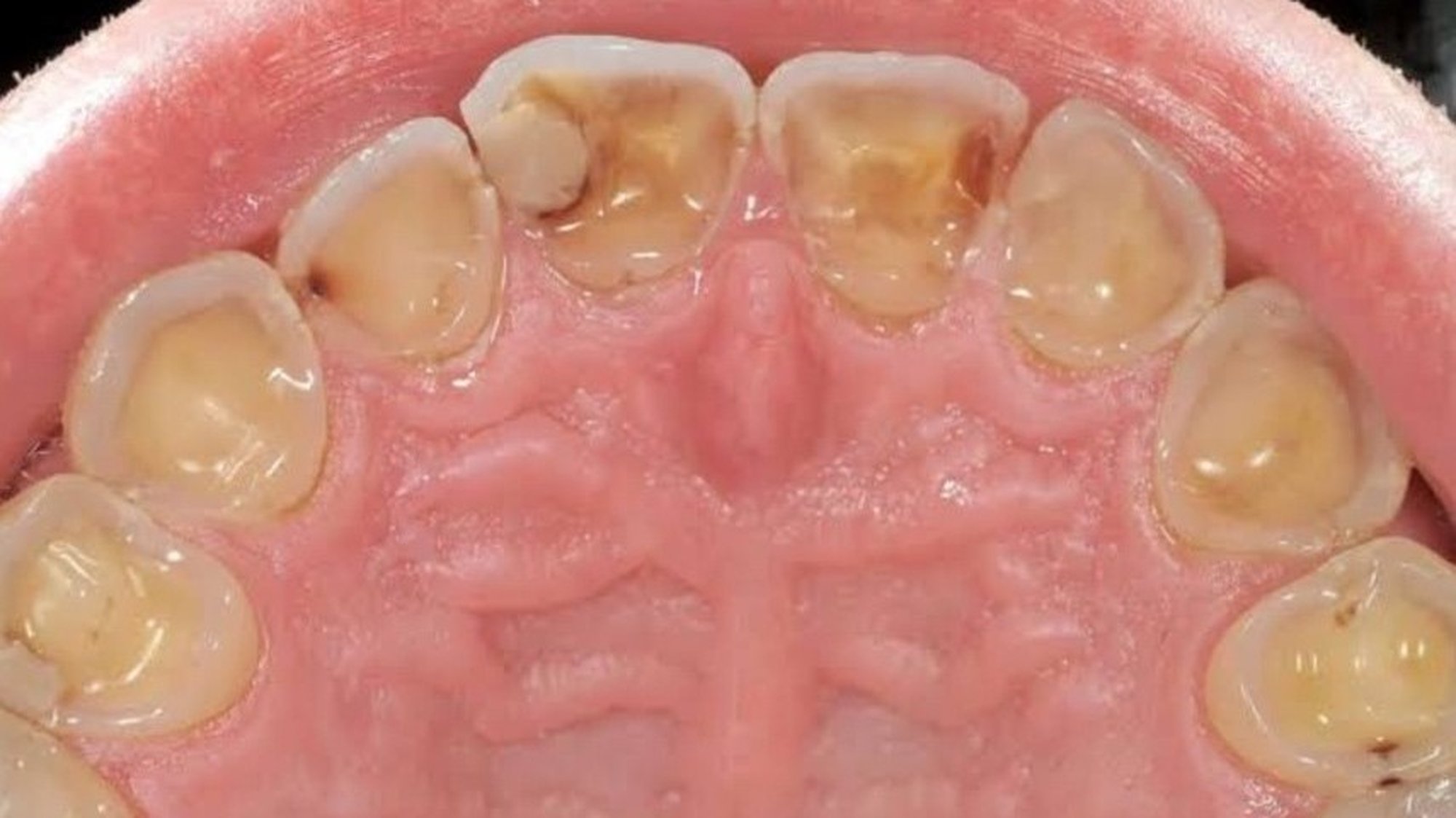 Aynı senaryoyu anoreksiya/blumia’da sık istifra etmeye bağlı olarak midenin asidik içeriğinin dişlerin arka bölgelerine teması sonucunda da izleyebiliyoruz. Bunu, en yukarıdaki görselde görebilirsiniz.
