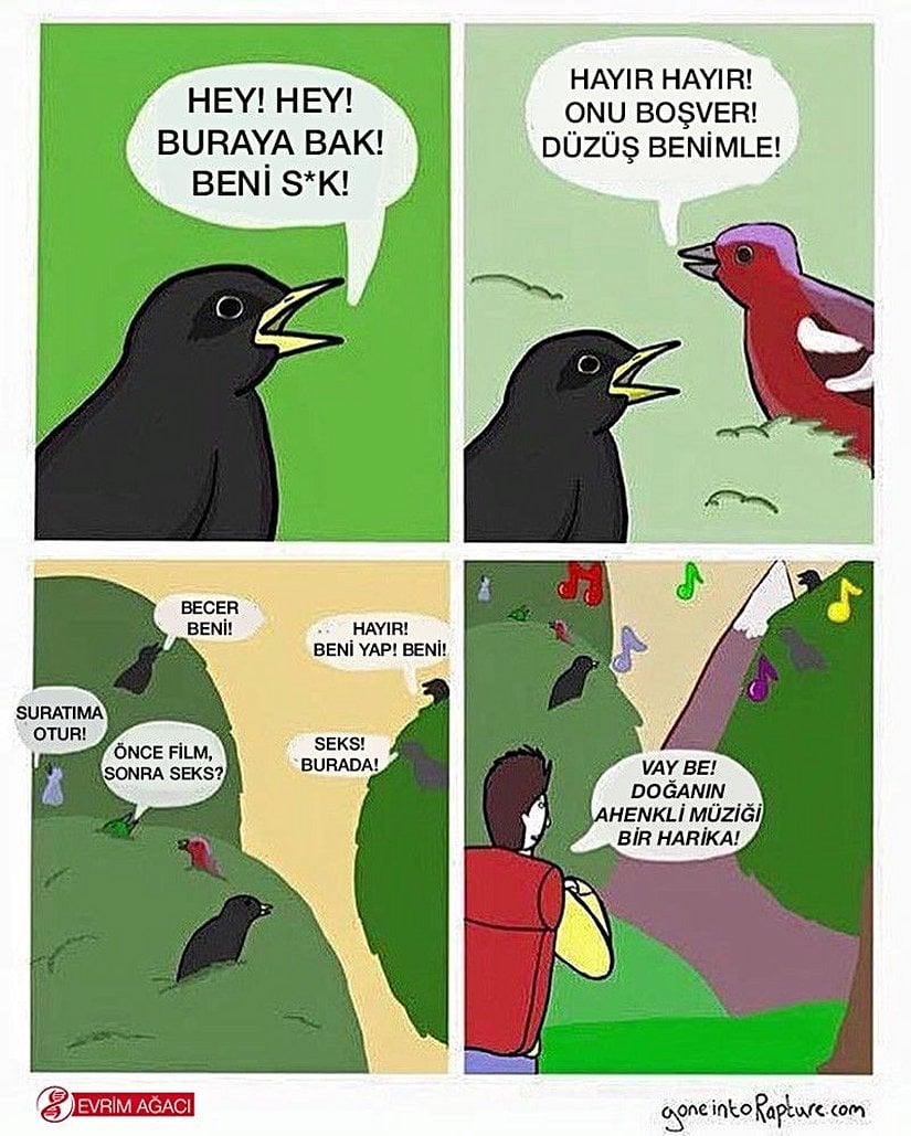 Gone into RaptureBu karikatürde gördüğümüz, bize son derece romantik ve hoş gelen kuş ötüşlerinin ezici bir çoğunluğunun erkekler tarafından dişilere yönelik seks çağrısı olduğudur. Gerçekten de ötücü kuşların büyük bir kısmının erkekleri, dişileri için envai çeşit sesler çıkararak onların dikkatini çekmeye, kendilerini onlara beğendirmeye çalışırlar. Bazı türlerde 3000 farklı şarkı bir arada söylenebilirken, bazı diğer türlerde sadece 1-2 ötüş tipi bulunur. Bu ötüşlerin her biri, ortamda bulunan dişilere "Ben diğerlerinden daha iyiyim, benimle çiftleş!" mesajı vermeye yarar. Kuş dilinden anlamayan biz insanlar içinse bu sesler hoş namelerden ibarettir.