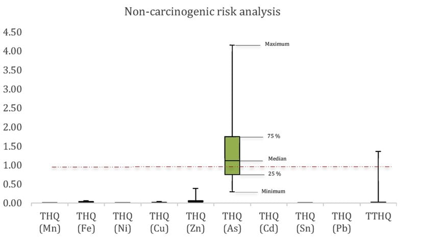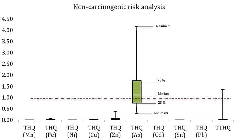 Grafiğin en sağında yer alan Toplam hedef tehlike katsayısı (TTHQ) ise, bu maddelerin tümüne birden maruz kalmanın sonucunda sağlık riski oluşup oluşmayacağını belirlemektedir. Görülebileceği gibi, arsenik düzeyleri riskli olduğu gibi, bu yüksek düzeyden dolayı toplam hedef tehlike katsayısı da, hata payına bağlı olarak 1'i geçen değerlere ulaşabilmektedir. Araştırmacılar şöyle yazıyorlar: