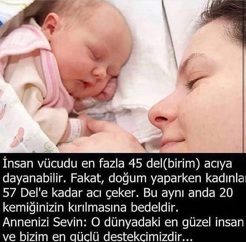 İnsan vücudu en fazla 45 del (acı birimi) acıya dayanabilir. Fakat doğum yaparken, kadınlar 57 del kadar acı çekerler. Bu, aynı anda 20 kemiğin kırılmasına eşdeğerdir. Annenizi sevin, çünkü o Dünya'daki en güçlü insan ve bizim en güçlü destekçimiz!