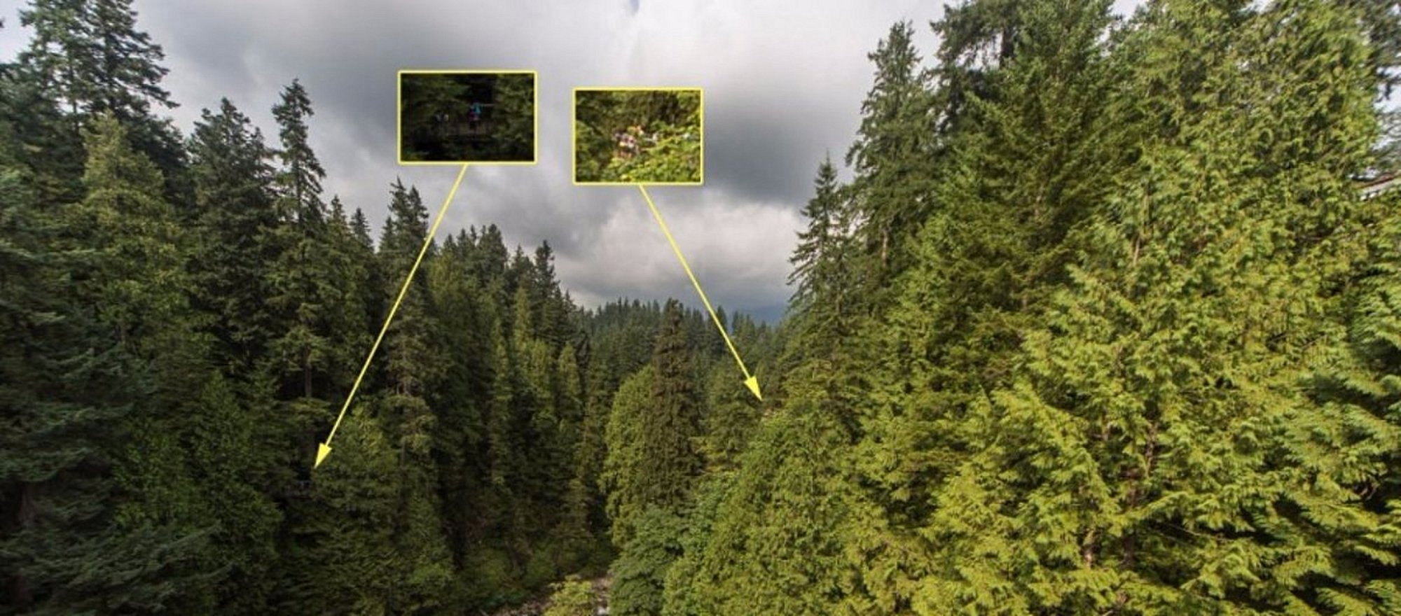 Cüneyt Özdaş tarafından Kanada'nın British Columbia eyaletinde bulunan Capilano Nehri üzerindeki Capilano Asma Köprüsü'nden çekilen bu muhteşem fotoğrafta insan(cık)lar, dev Douglas Göknarları içerisinde küçük birer karınca gibi gözüküyorlar. Öyle ki, görebilmek için epey bir yakınlaşmamız gerekiyor.