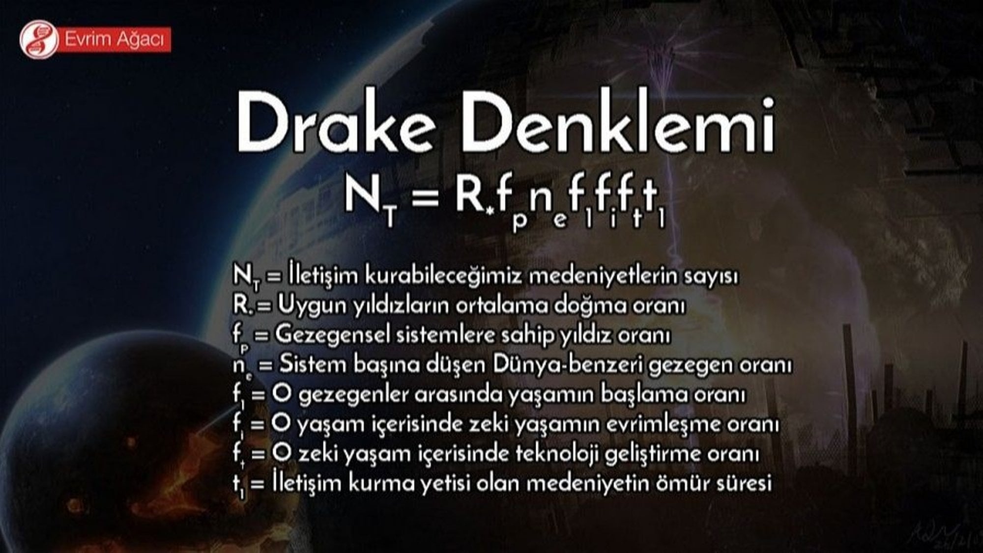 Bu denklem, Samanyolu içindeki yıldız ve gezegenlerin sayısı, yıldızların ömür süreleri gibi oldukça iyi bilinen ve çok büyük, her anlamda ‘astronomik’ faktörlerle, kimyasal/biyolojik süreçlerin hayatın oluşturabilmesi olasılığını içeren ve daha az bilinen bazı temel-bilimsel faktörler yanında, hakkında daha da zor tahminlerde bulunabildiğimiz (canlılarda "akıl" denen yapının evrimleşmesi, gelişmesi, bir medeniyet kurması, bilimsel metodu keşfetmesi, astronomiyi geliştirmesi, benzeri akıllılarla temas kurmak istemesi ve bu arada, ‘kendini yoketmemesi’ gibi olasılıkları içeren) bazı psikolojik/sosyolojik faktörlere de sahiptir.