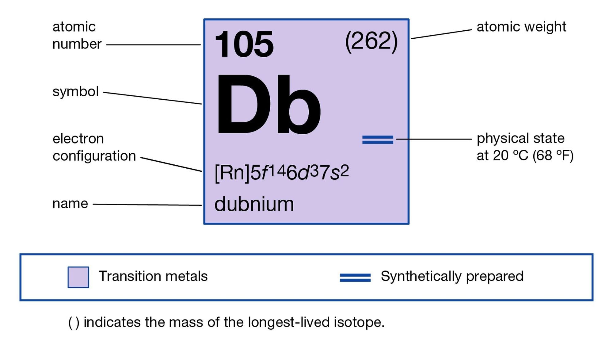 - Dubniyum, adını Rusya'da ilk yapıldığı yer olan Dubna'dan almıştır. Sadece nükleer bir tesiste üretilebilir. Dubniyum Dünya'da doğal olarak mevcut değildir.