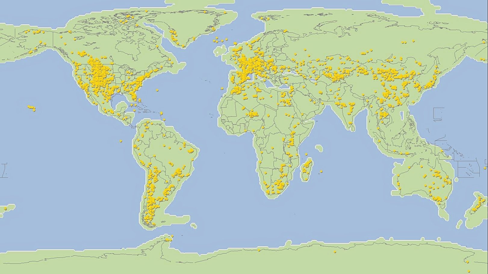 Bu haritada, Dünya'da bugüne kadar çıkarılmış neredeyse tüm dinozor fosillerinin keşif noktaları gösterilmektedir. Her bir sarı nokta, bir fosil alanına işaret etmektedir. Tabii ki, tek bir kazı alanından birden fazla fosil de çıkarılabilmektedir.