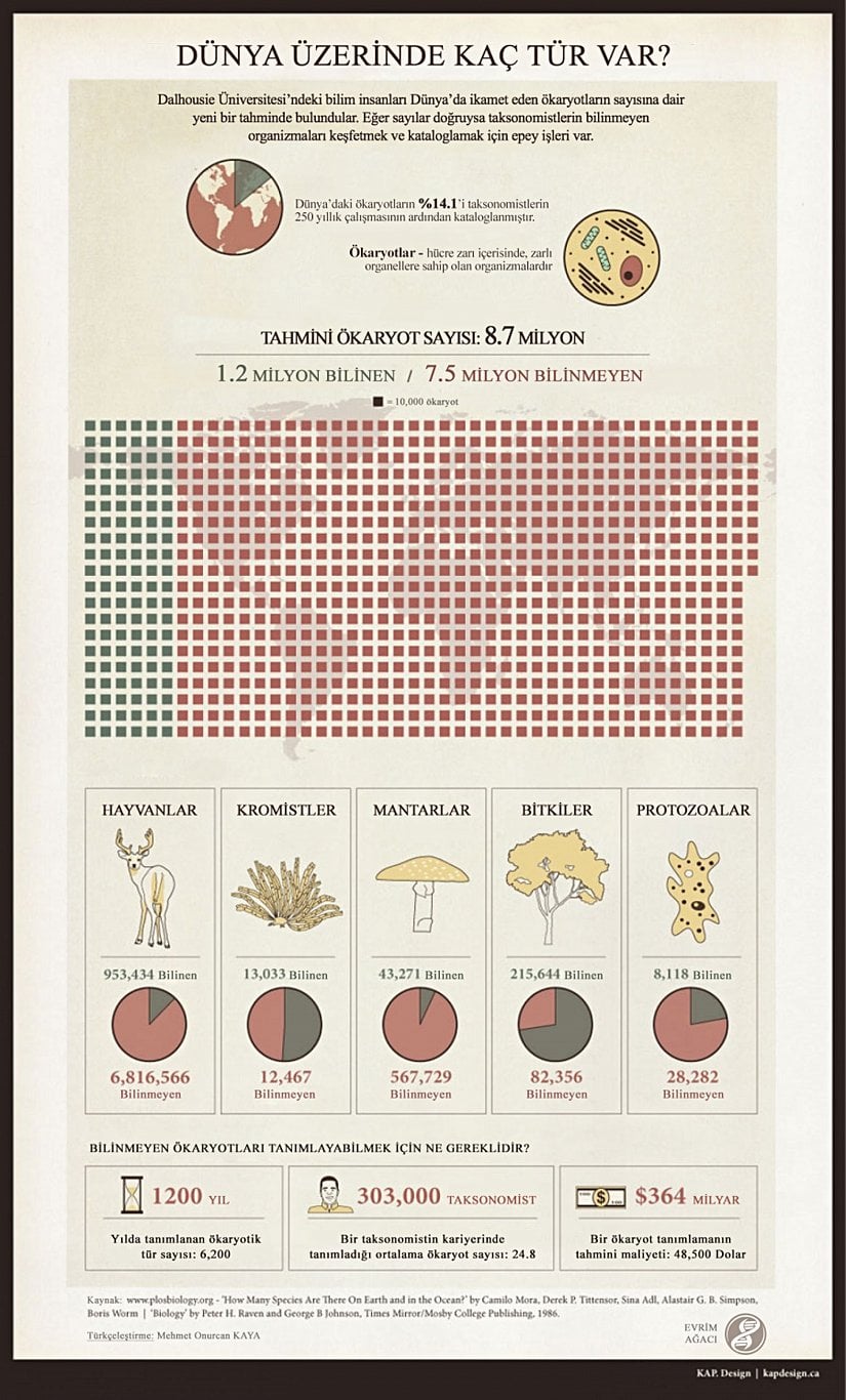 Bu türlerin sadece çok küçük bir kısmını keşfedip, isimlendirip, evrimsel geçmişlerine göre sınıflandırmalarını yapabildik, çünkü halen keşfedilmeyi bekleyen milyonlarca tür bulunuyor. Kabaca bir sayı verecek olursak, ökaryotların (ki görselde gösterilenlerin tamamı ökaryotlardır) sadece 2 milyonunu, prokaryotların ise birkaç milyonunu keşfedebildik. Daha kendi Dünya'mızı hiç tanımadığımız söylenebilir.