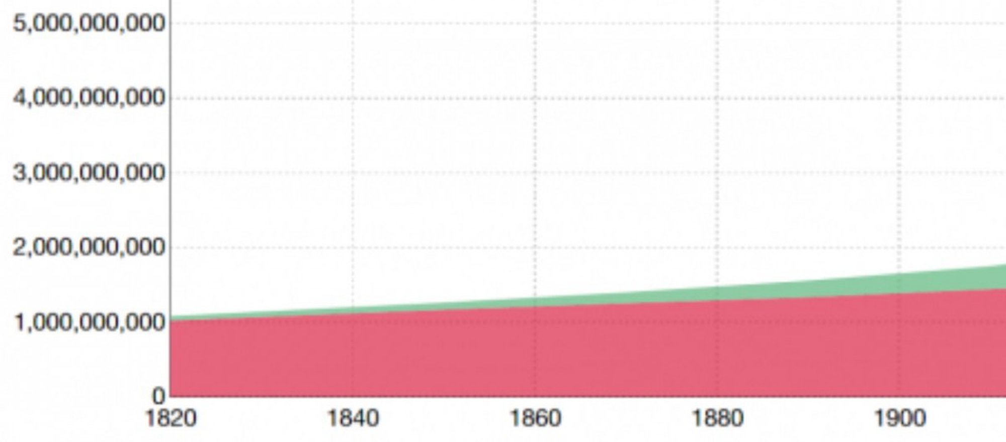 Görseldeki veri, 1820 yılları ile 2015 yılları arasında Dünya'daki "yoksulluk sınırının altında yaşayan insan" sayısının değişimini göstermektedir. Kırmızı olan bölge bu sınırın altındaki insanları, yeşil olansa üstündeki insanları göstermektedir. Bu durumda, göreceğiniz üzere, Dünya'da yoksulluk hızla azalırken, yoksulluk sınırının üzerindeki insan sayısı giderek artmaktadır.