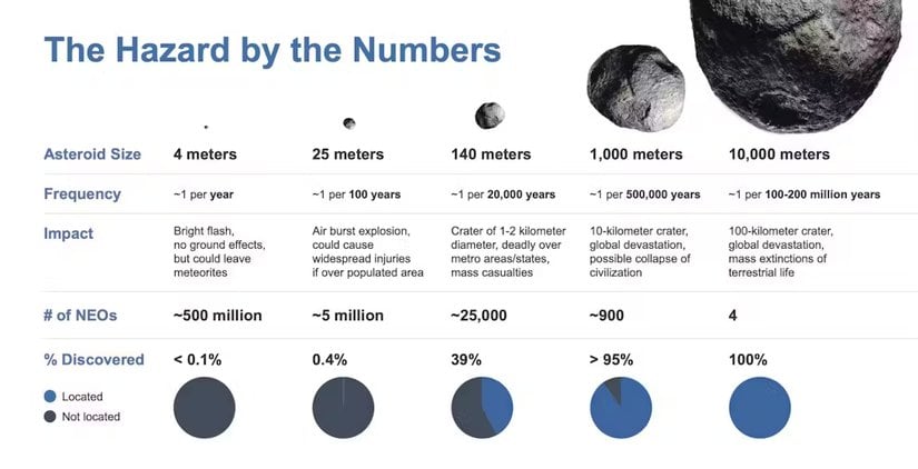 Bir asteroidin tehlike potansiyelini belirleyen başlıca etmenler boyutu, hızı, yoğunluğu (kompozisyonu) ve yörünge geometrisidir. Aşağıda, asteroit boyutuna göre olası çarpma etkileri özetlenmiştir: