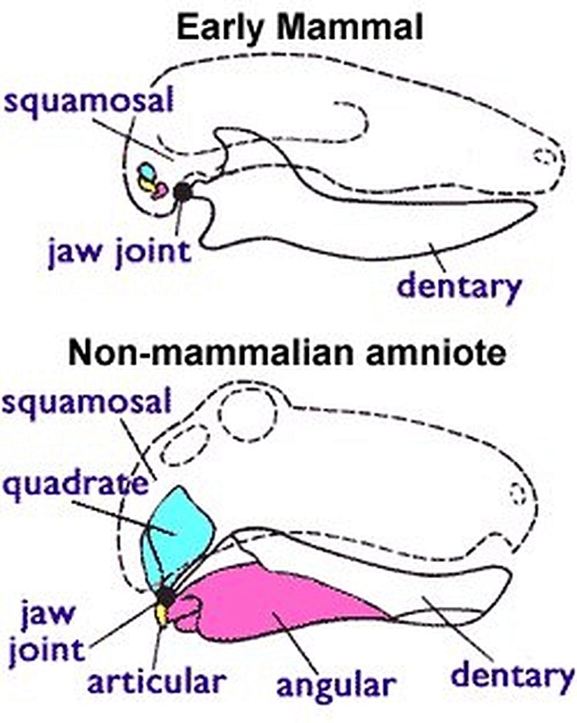 Alt tarafta, memeli olmayan bir amniyot olarak sürüngenlerin çene yapısı gösterilmiştir. Üst tarafta ise, günümüz modern memelilerine ait bir kafatası görmekteyiz. Kemik yapıları ve dağılımları incelenir ve anatomik bir gözle araştırılırsa, bu kemikler arasındaki homoloji (benzerlik) net bir şekilde görülecektir.