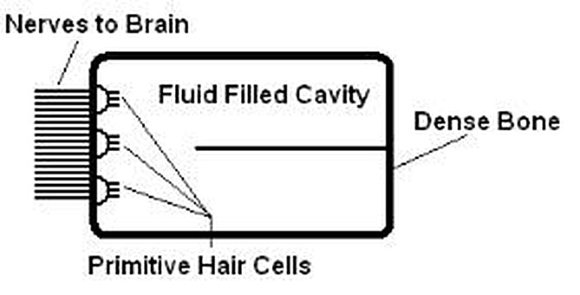 Yukarıdaki şekilden de basitçe görülebileceği gibi, sağ yüzeydeki kemik (dense bone) yapısı sayesinde, yerden ve havadan alınan titreşimler doğrudan elektriksel sinyale dönüştürülmektedir. Günümüzde, bazı semenderlerin halen buna benzer bir kulak yapısı bulunmaktadır. İlginç bir şekilde, titreşimler bu hayvanda sadece kulak bölgesine ait kemiklerle değil, vücudun her yanındaki kemiklerle alınıp, birbirleri üzerinden bu yapıya iletilmektedir. Vücudun her bir yanından alınan titreşimler, sıvı dolu boşluk (fluid-filled cavity) içerisinde bulunan ilkin kılsı hücreler (primitive hair cells) tarafından, elektrokimyasal sinyallere dönüştürülmektedir. Bu da aslında bir yerde günümüz modern kulağında hala neden pek çok kemik yapısının bir arada çalıştığını açıklamaktadır.
