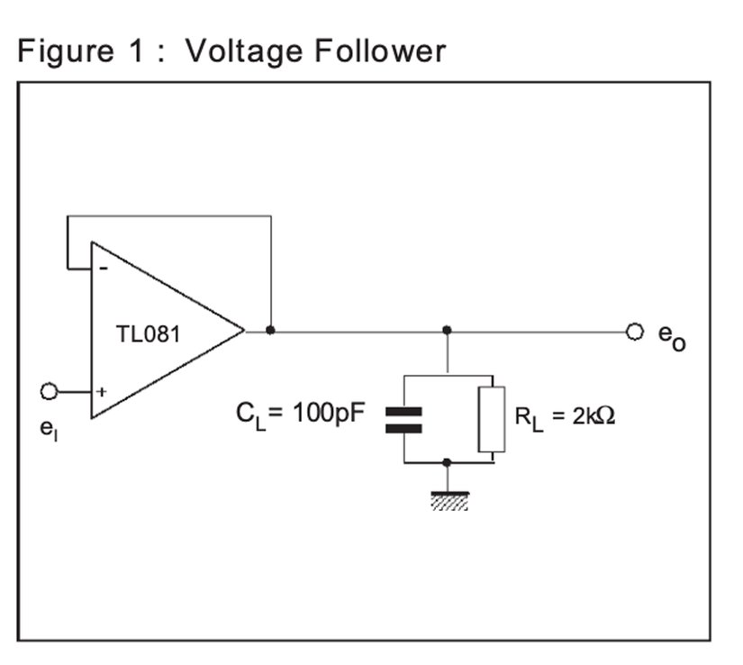 Bunu, sözünü ettiğimiz opamp elemanına ait veri dosyasına (İng: "datasheet") bakarak doğrulayabiliriz. TL081 model numarasına sahip opampın veri dosyasında voltaj takip (İng: "voltage follower") devresi örneği gösterilmektedir: