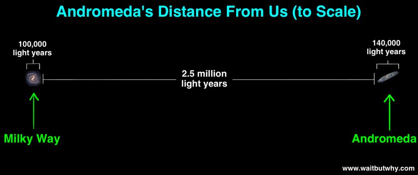 Wait But Why2.5 milyon yıl önce Dünya'da, (biri biz Homo sapiens türü olmak üzere) bugün bildiğimiz en az 13-14 türüyle Homo cinsinin bile henüz evrimleşmediği düşünülecek olursa, yola çıktıktan sonra Andromeda'ya vardığınızda, Dünya'nın ne kadar değişeceğini hayal edebilirsiniz. Siz ışık hızında giderken zaman sizin için tamamen dururdu ve yaşlanmazdınız; ancak Andromeda'ya ulaştığınız anda, Dünya'da takvimler 2.5 milyon yıl sonrasını gösteriyor olurdu!