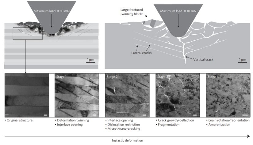 NatureBuradaki en ilgi çekici olay, alt görsellerden soldan ikincisinde ("Stage 1" olarak işaretlenmiştir) görülen kristal ikizlenmesi olayıdır. Bu olay sayesinde malzemenin etrafa enerji saçması mümkün olmaktadır ve bu sırada, kristal katmanları oryantasyonlarını değiştirerek üzerlerine binen yükten kaynaklı sünmeye bir süreliğine direnebilmektedir. Ancak bir noktada kırılma yaşanmaktadır ve nihayetinde malzeme yine amorfize olmaktadır.