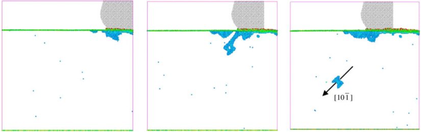 Computational Materials ScienceVakaların her üçünde de bıçak, bakır malzemenin sağ tarafıyla temas etmekte ve sonrasında sola doğru sürüklenmektedir. Bu işlem sırasında atomların, bıçağın hemen etrafındaki bölgede (yukarıda bahsettiğimiz nedenle) yüksek basınç altında amorfize olduğunu ve bıçakla birlikte deforme olduğunu görebiliyoruz. Bu, bir şeylerin kesilmesi ardında yatan ana moleküler mekanizmadır.