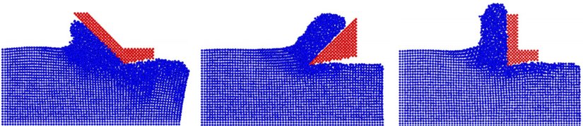 Örneğin bu konuda yapılan bir moleküler dinamik araştırmasında, bakır bir malzemeyi (aşağıda mavi renkte gösterilmiştir), farklı şekildeki bıçaklarla (kırmızı) kesip, malzemenin nasıl davrandığı incelenmiştir:[1]