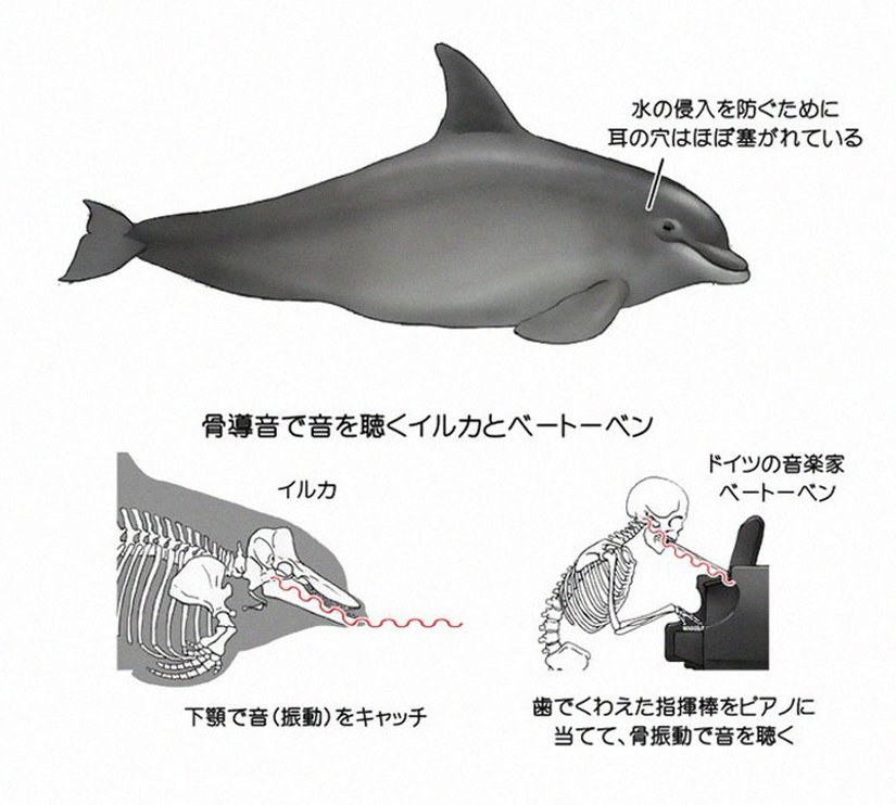 Kawasaki'nin çizimlerine yansıyan bir diğer mekanizma, yunuslarda görülen kemik kondüksiyon sesi olgusu. Ses, hava gibi bir ortamda iletilildiği gibi, kemikler boyunca da iletilir ve yunuslar gibi hayvanlar bu kemik boyunca iletilen sesleri algılayarak çeşitli cisimlerin (örneğin avlarının) yerlerini tespit edebilirler.