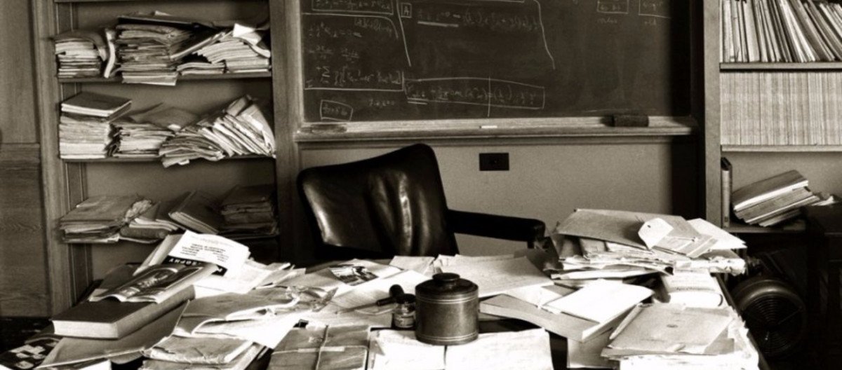 Bazı fotoğraflar, göründüklerinden fazla şey anlatırlar. Bir çalışma odası mı? Öyle gözüküyor, sıradan, dağınık bir masa, arka planda kara tahtaya yazılmış birkaç formül, dağınık raflar... Oldukça sıradan gibi. Sadece biraz dağınık. Einstein'ın (güvenilir kaynaklardan doğrulanamıyor olsa da) şöyle söylediği iddia edilir: "Dağınık bir masa, dağınık bir zihin anlamına geliyorsa, boş bir masa ne anlama gelir?"