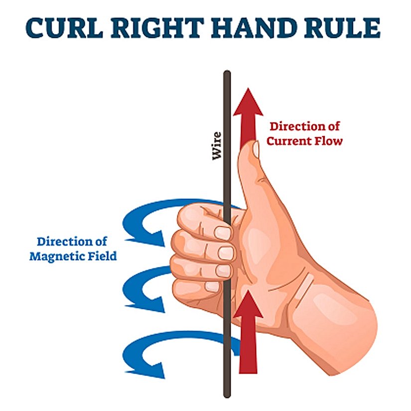 Baş parmağınız elektronların akış yönüne işaret ettiğinde (örneğin yukarıdaki görselde elektronlar yukarı doğru akıyor olsun, dolayısıyla baş parmağımız da tel boyunca yukarı doğru yerleştirilir) diğer dört parmağınızın kavradığı yön, elektrik alanın hareketi nedeniyle bu tel etrafında oluşan manyetik alanın yönünü göstermektedir. Yani yukarıdaki örnekte manyetik alan telin etrafında 4 parmağın (ve dolayısıyla mavi okların) gösterdiği yöndedir. Telin sağ tarafında manyetik alan ekranın içine doğru, sol tarafında ekrandan dışarı doğrudur.