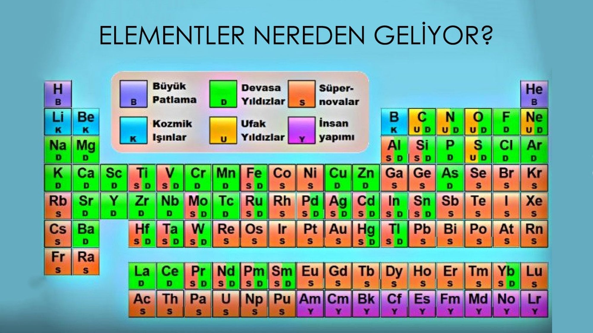 Periyodik tabloyu incelersek, elementlerin büyük çoğunluğunun yıldız çekirdeklerinde ve süpernova patlamalarında oluştuğunu farkedebiliriz. Periyodik tablonun sağ altı köşesinin neredeyse hepsi pembe renktedir. Bu, bize ağır atomların sadece süpernova patlamalarında oluştuğunu göstermektedir. Atom ağırlıkları azaldıkça yeşil ve sarı renkler de tabloda yerini alır. Bu atomlar ise yıldızlarda oluşmuştur.