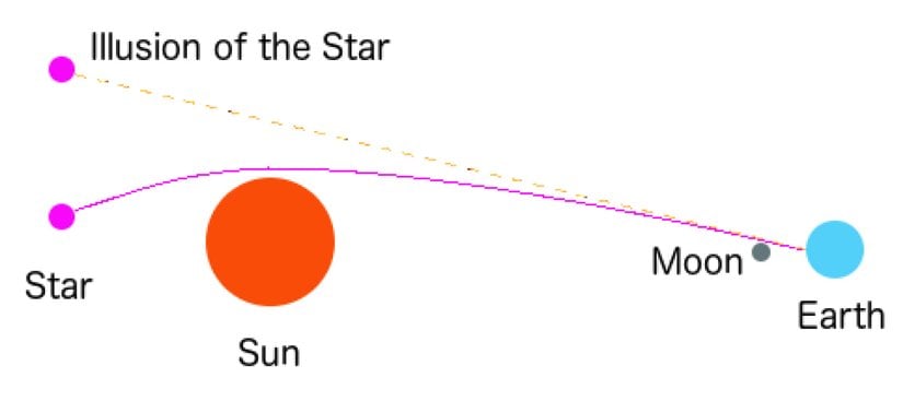 Gökbilimciler, gökyüzündeki yıldızların Güneş ve Dünya'ya göre konumlarını bilirler. Aşağıdaki konfigürasyonda gösterildiği gibi, Güneş'in diğer tarafında da belirli yıldızlar vardır. Bunlardan birinin ışığı düz bir çizgide ilerleseydi, Güneş tarafından engellenirdi ve bize asla ulaşamazdı; dolayısıyla Dünya'daki bir gözlemci yıldızdan gelen ışığı göremezdi. Bununla birlikte, Güneş'in tam arkasında kalan o yıldız, noktalı çizgi ile gösterildiği gibi bir yanılsama sayesinde, bir tutulma olayı sırasında net bir şekilde gözlendi: