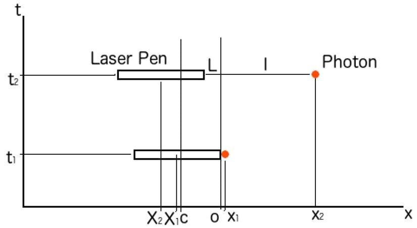 Bu durumda, uzay boşluğunda fotonları saçan kaynak, t2t_2 anında gösterildiği gibi saçtığı fotonlardan uzaklaşacaktır; tıpkı arkasından alev püskürten bir roketin, püskürttüğü parçacıklardan zıt yöne doğru uzaklaşması gibi. Kalem, L\text{L} metre sola gittiğinde, ondan çok daha hafif olan fotonlar, orijinal konumundan l\text{l} metre sağa hareket edecektir: