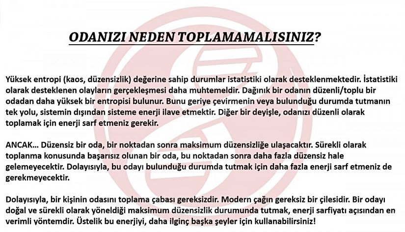 Dolayısıyla, bir kişinin odasını toplama çabası gereksizdir. Modern çağın gereksiz bir çilesidir. Bir odayı doğal ve sürekli olarak yöneldiği maksimum düzensizlik durumunda tutmak, enerji sarfiyatı açısından en verimli yöntemdir. Üstelik bu enerjiyi, daha ilginç başka şeyler için kullanabilirsiniz!