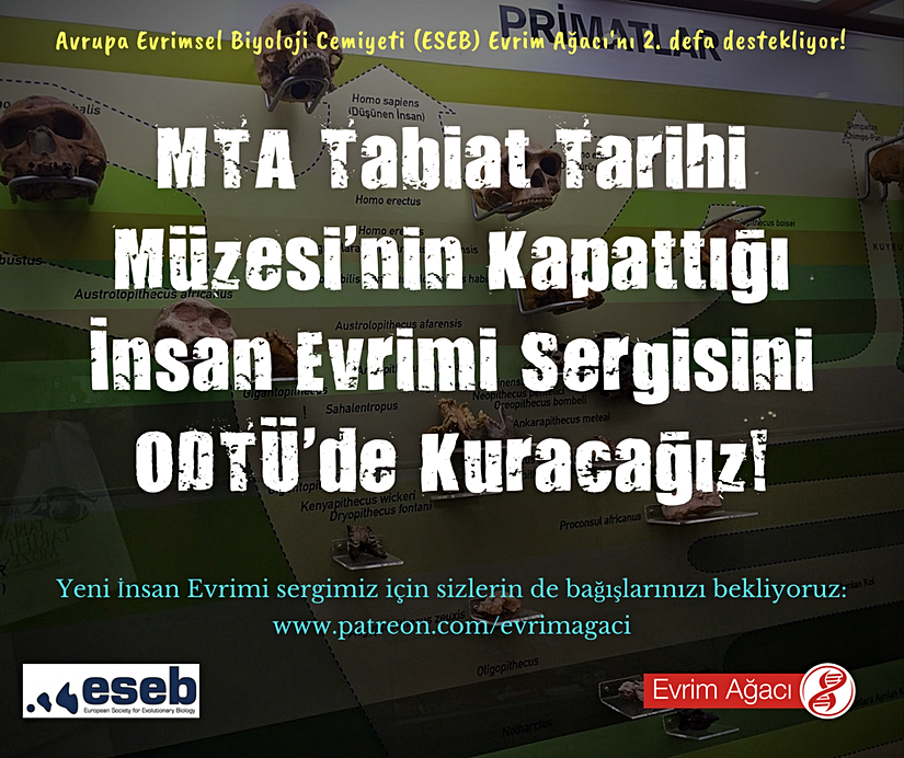 Şimdi de, MTA'nın kaldırmayı seçtiği "İnsan Evrimi" sergisini, ODTÜ'de yeniden inşa etmek ve halkımıza sunmak için kolları sıvadık! Proje dosyamızı Avrupa Evrimsel Biyoloji Cemiyeti (ESEB) Destek Fonu'na gönderdik ve kurul elemesi sonucunda projemizin ESEB tarafından destekleneceği yanıtını aldık! Bu, Evrim Ağacı'nın ESEB destekli ikinci projesi! Çok sayıda başvurunun yapıldığı bu fonda ikinci defa başarıya ulaşmak, Evrim Ağacı olarak ülkemizi yurt içinde ve yurt dışında temsil gücümüzü bir kez daha göstermekte ve bizleri sevindirmektedir. İlk başvurumuz, Evrim Ağacı'nın ilk kuruluşu sırasında, il il, okul okul gezerek evrimi anlatmaktı. Şimdi de, kalıcı bir evrim sergisi ile bunu taçlandıracağız!