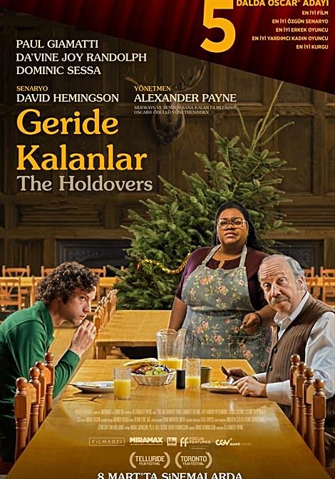 5 dalda Oscar adayı olan The Holdovers, ABD'nin prestijli yatılı liselerinden birinde 1970’i 1971’e bağlayan yılbaşı tatilini okulda birlikte geçirmek zorunda kalmak huysuz öğretmen Paul, yas sürecindeki aşçı Mary ve ailevi problemlerini nasıl çözeceğini bilemeyen uçarı öğrenci Angus'ın hikâyesini anlatıyor.