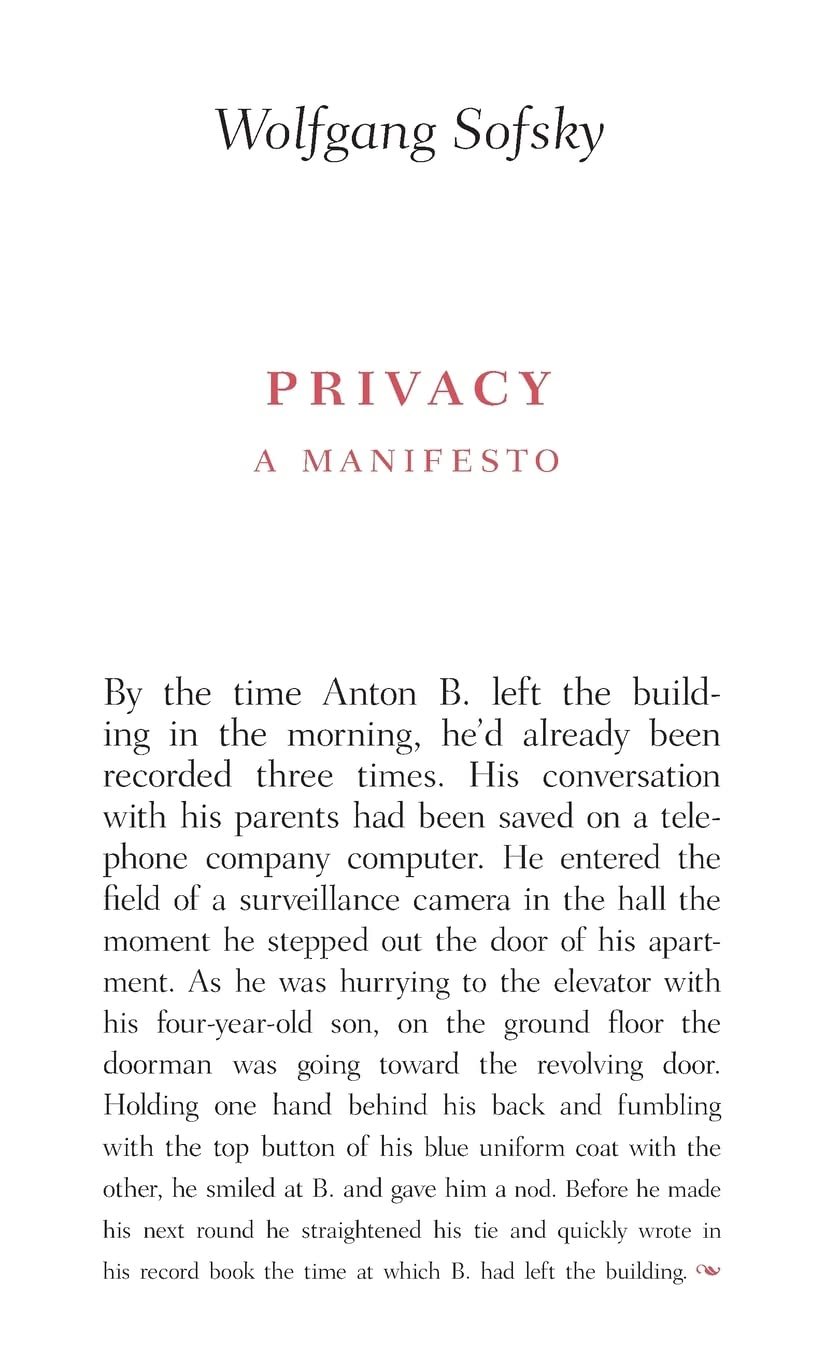 Ancak, ünlü sosyal düşünür Wolfgang Sofsky'nin bu kısa ve güçlü mahremiyet savunusunda gösterdiği gibi, ne teknoloji ne de terörizm korkusu tüm suçu hak ediyor. Aksine, kayıtsızlık ve ilgi çekme arzusuyla mahremiyetimizin kaybına ortak olduk. Yeni bir çağda yaşamanın kaçınılmaz bedeli olarak mahremiyetin ortadan kalkmasına boyun eğmediğimiz zamanlarda, kişisel bilgileri tanıdığımız insanlara -ve giderek artan bir şekilde tanımadığımız insanlara- ifşa etme fırsatlarını hevesle kucaklıyoruz.