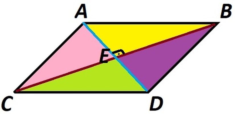 Köşegenler yalnızca açıları değil, dörtgenin alanını da eş parçalara böler. Aşağıdaki şekilde gösterilen renkli alanların her biri, birbirine eş dik üçgenlerdir. Buradan şöyle bir sonuç da çıkarabiliriz: Bir eşkenar dörtgenin iki köşegeni de onun alanını iki eş parçaya böler. Ancak burada dikkat etmelisiniz ki alanını iki eş parçaya bölmesi, köşegenleri şeklin simetri ekseni yapmaz!