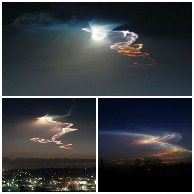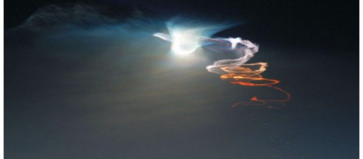 Görselde gördüğünüz "esrarengiz parıltı" olarak isimlendirilen olay, bir alacakaranlık fenomenidir. Bu gökyüzü efekti, güneşin doğumundan 30-60 dakika önce veya güneşin batımından 30-60 dakika sonra fırlatılan roketlerin havada bıraktıkları izden ötürü oluşur. Roketten fırlayan buhar izleri, havada yoğunlaşarak buz kristallerine dönüşürler ve bunlar, üst atmosfere saçılmaya başlar. Bu bölgede buzun genleşmesiyle, yeni doğan veya yeni batan güneşin açısından ötürü çok renkli bir ışık şöleni oluşur.