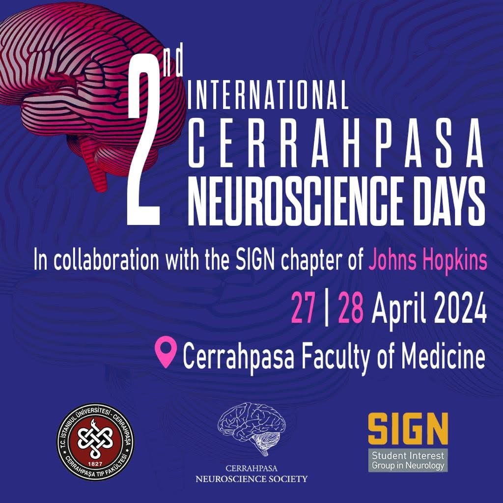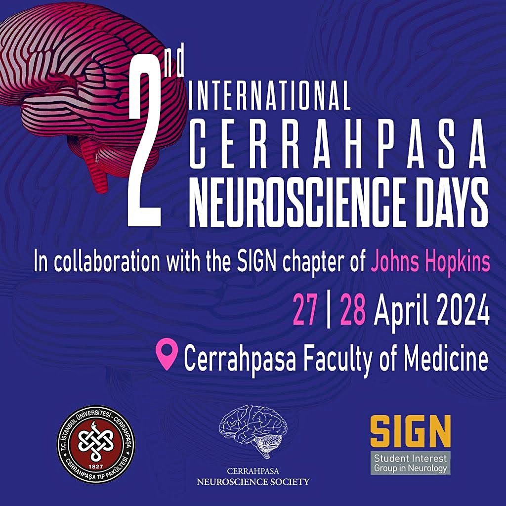 Cerrahpaşa Nörobilim Kulübü olarak 27-28 Nisan tarihlerinde 2. Uluslararası Cerrahpaşa Nörobilim Günleri'ni düzenliyoruz. Johns Hopkins Faculty of Medicine Student Interest Group in Neurology ile ortak olarak düzenlediğimiz bu etkinlikte çalışmalarıyla dünya çapında tanınmış Prof. Jean Claude Baron, Prof. Ola Hermanson ve Prof. Dr. Gerhard Schratt'in yanı sıra Cerrahpaşa Tıp Fakültesinden alanında çok önemli çalışmalara imza atmış hocalarımız yer alacak. Cerrahpaşa Tıp Fakültesi yerleşkesinde yer alacak etkinliğimize sizleri de bekliyoruz! Henüz tamamını duyurmadığımız programla ilgili bilgi almak ve başvuru yapmak için yazdığım linkleri kullanabilirsiniz. Görüşmek üzere!