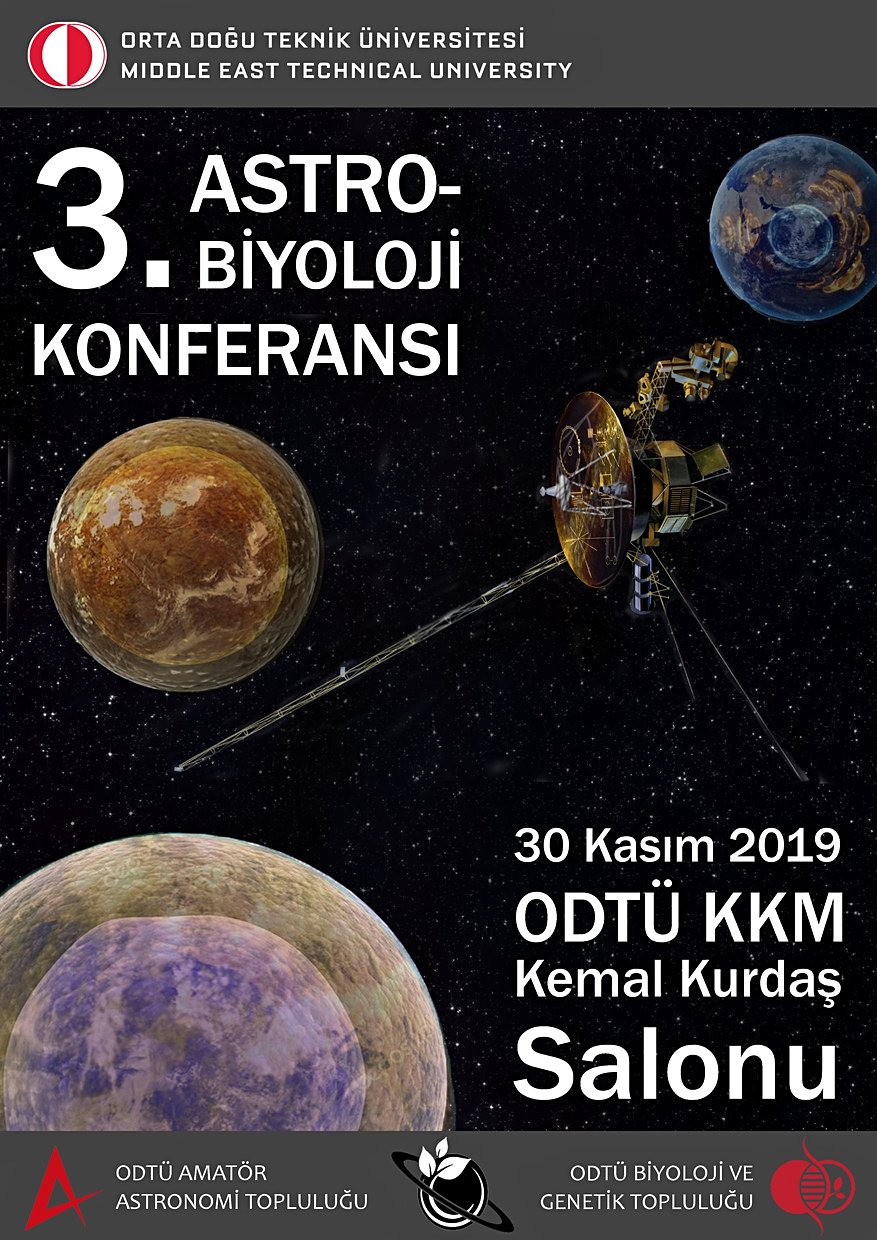 Geçtiğimiz yıllarda birinci ve ikincisini gerçekleştirdiğimiz Türkiye'nin ilk ve tek Astrobiyoloji Konferansı'nın bu sene üçüncüsünü Orta Doğu Teknik Üniversitesi Kültür ve Kongre Merkezi Kemal Kurdaş Salon'unda gerçekleştireceğiz. Kayıtlarımız 17 Ekim Perşembe günü açılacaktır. Tüm astrobiyoloji meraklılarını bekliyoruz!