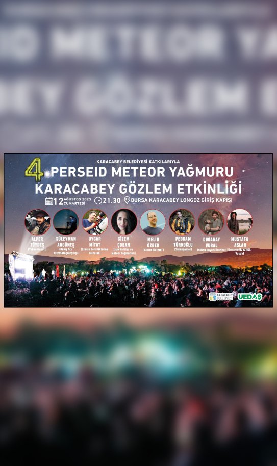 Adem Amca ve Yaren Leylek hikayesi ile bilinen kuş ve yaban hayatı fotoğrafçısı Alper Tüydeş’in önderliğinde 4. Perseid meteor gözlemi etkinliğine her meraklı davetlidir! Bu yıl meteorları izlemek için 12 Ağustos Cumartesi gecesi Bursa Karacabey'de (Yeniköy Sahilinde) buluşuyoruz. Tek yapmanız gereken çıkıp gelmek. Kayıt gerektirmeyen ve tamamen ücretsiz olan bu gökyüzü gözlem etkinliğine dair tüm detaylar: