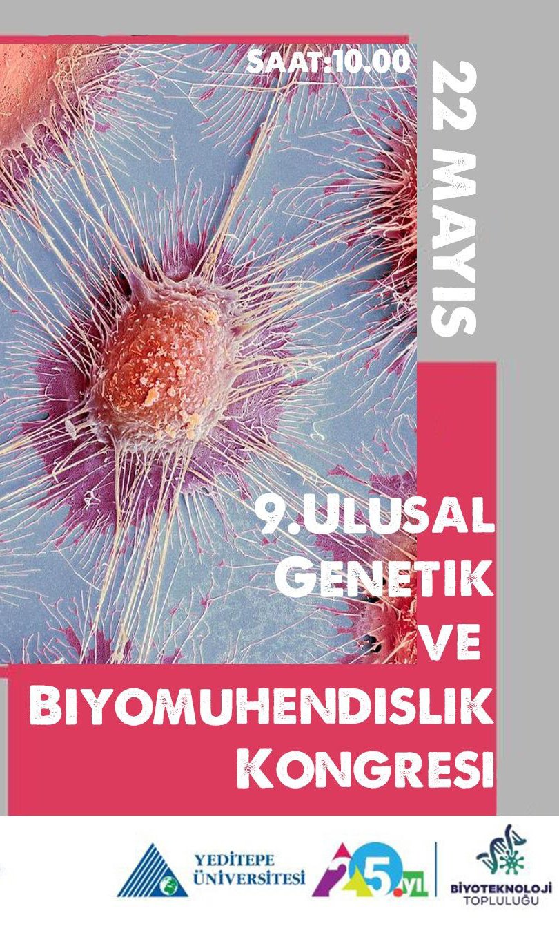 Herkese merhabalar ! 9.Ulusal Genetik ve Biyomühendislik öğrenci kongremizi 22 Mayıs Pazar günü saat 10.00’da başlıyor !🧬 Etkinliğimiz Yeditepe Üniversitesi Güzel Sanatlar Fakültesi Konferans Salonunda gerçekleşecektir. Alanında uzman hocalarımızla gerçekleştireceğimiz kongremiz, interaktif bir ortamda, birbirinden farklı konuları ele alacaktır. Kongremizin katılım ücreti 40 liradır. Kayıt formunun linkine ‘’ buradan ulaşabilirsiniz.🧫🧪🧑🏻🔬 Katılımlarınızı dört gözle bekliyoruz!
