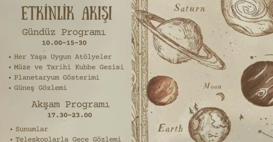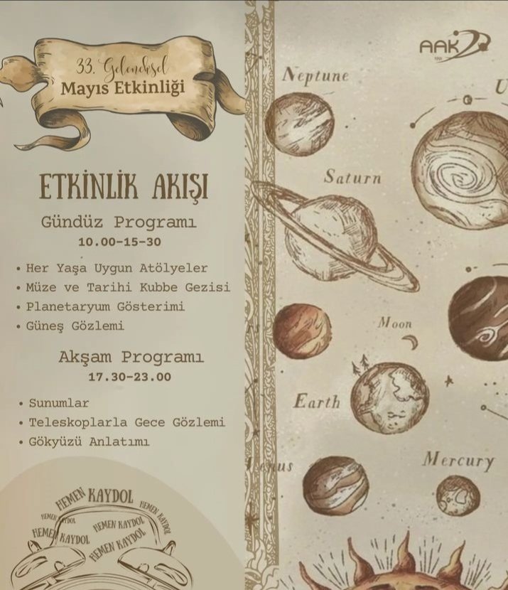 İstanbul Üniversitesi Astronomi ve Uzay Bilimleri Bölümü'nde Amatör Astronomlar Kulübü tarafından düzenlenen 33. Geleneksel Mayıs Etkinliği'nde Sabah saatleri çocuklara ve yetişkinlere yönelik atölyeler, güneş gözlemleri ile kubbe müze sunumları yapılırken akşam saatleri yetişkinlere yönelik bilimsel sunumlar yapılacaktır.