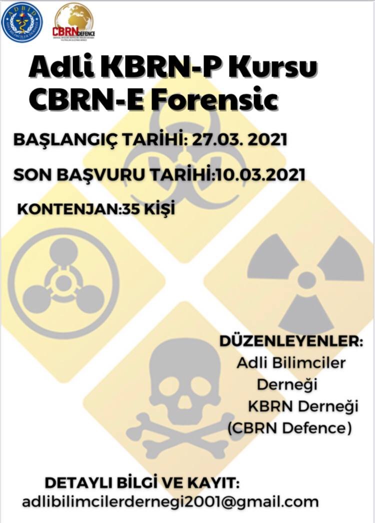 Dünyada halen tehdidi devam eden KBRN (Kimyasal, Biyolojik, Radyolojik ve Nükleer) ajanlara yönelik savunma faaliyetleri ile ilgili her türlü konuyu ele alabilen ve bu alanı ülkemizde yaygınlaştırmak adına ortak bir platform oluşturmak için kurulan KBRN Savunma Politikaları Geliştirme Derneği ülkemizde KBRN farkındalığının ilerlemesi maksadıyla, Adli Bilimciler Derneği ile birlikte bir online KBRN Kursu düzenleyecektir. Kursa yönelik bilgiler aşağıda verilmiştir.