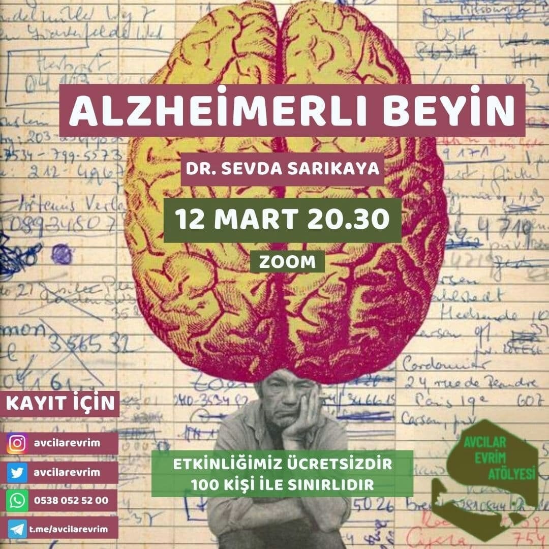 12 Mart Cuma günü 20.30'da, Dr. Sevda Sarıkaya ile birlikte "Alzheimerlı Beyin" üzerine konuşacağız. Etkinlik bağlantısı Whatsapp ve Telegram duyuru gruplarımız üzerinden paylaşılacaktır. Gruplara katılmak için mesaj atabilirsiniz.