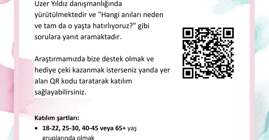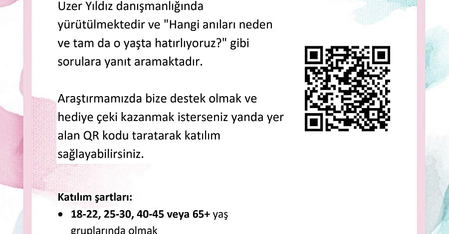 Araştırmamızdan bahsetmek gerekirse, TED Üniversitesi Psikoloji Bölümü Öğretim Üyesi Prof. Dr. Tuğba Uzer Yıldız danışmanlığında yürütülmekte ve "Hangi anıları neden ve tam da o yaşta hatırlıyoruz ve bunun psikolojik iyi oluş ile ilişkisi nedir?" gibi sorulara cevap aramaktadır. Araştırmayla ilgili detaylı bilgiye linke tıklayarak erişebilirsiniz.