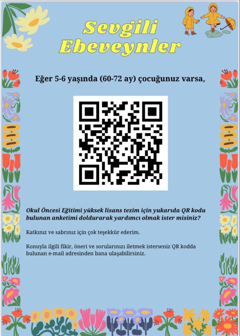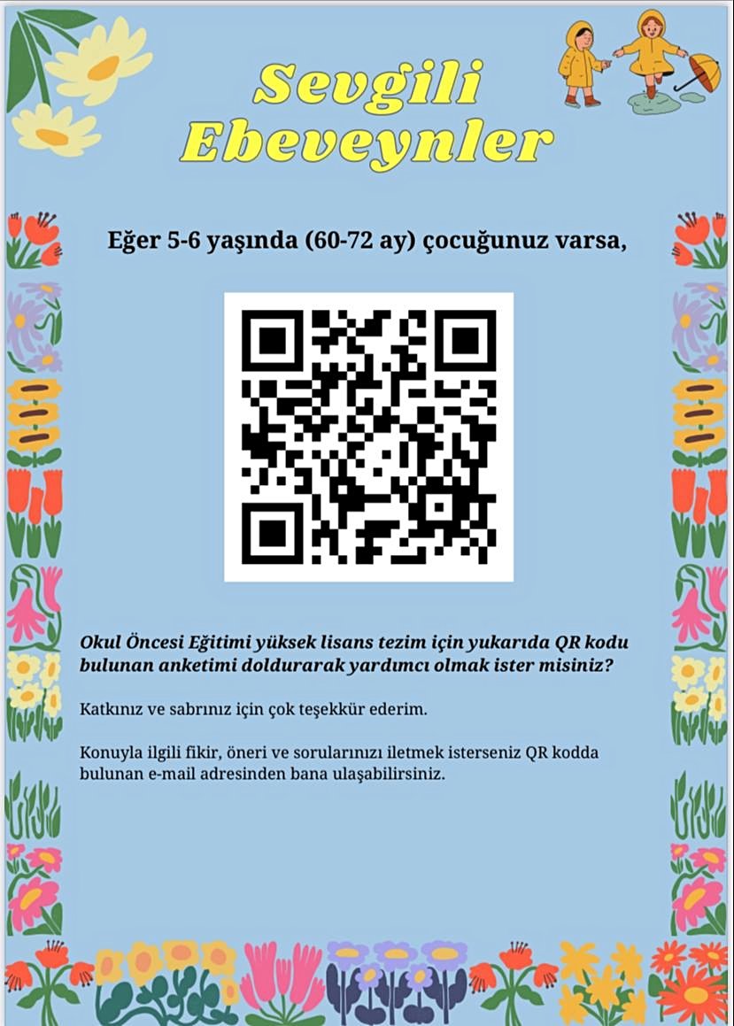 Merhabalar. Ben Okul Öncesi Öğretmeni Hilal Doğan. Yüksek lisans tezim kapsamında medya okuryazarlık düzeyleri ile medya aracılık davranışları arasındaki ilişkiyi incelemek amacıyla Ankara’da yaşayan ve 5-6 yaşında çocuğu olan anne ve babalara ulaşmaya çalışıyorum. Aşağıda linki bulunan anketi doldurarak ya da ilgili kişilere ileterek yardımcı olabilirseniz çok sevinirim.