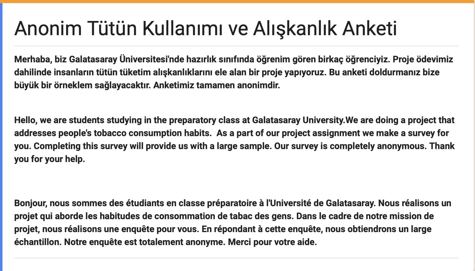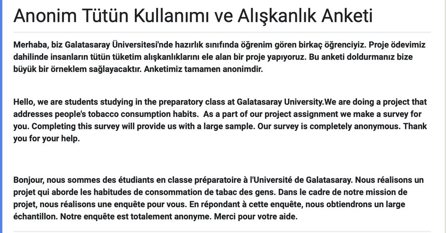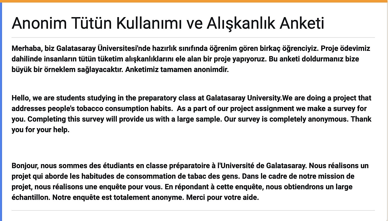 Merhaba, biz Galatasaray Üniversitesi'nde hazırlık sınıfında öğrenim gören birkaç öğrenciyiz. Proje ödevimiz dahilinde insanların tütün tüketim alışkanlıklarını ele alan bir proje yapıyoruz. Bu anketi doldurmanız bize büyük bir örneklem sağlayacaktır. Anketimiz tamamen anonimdir. Bize zaman ayırdığınız için teşekkür ederiz.